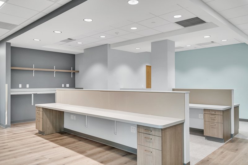 The dynamic reception and waiting space offer patients a rejuvenated retreat environment. The scope included large millwork and dynamic lighting throughout the open space, as well as in the 39 medical, surgical, and cosmetic exam rooms. In addition, break rooms were added and individual offices.