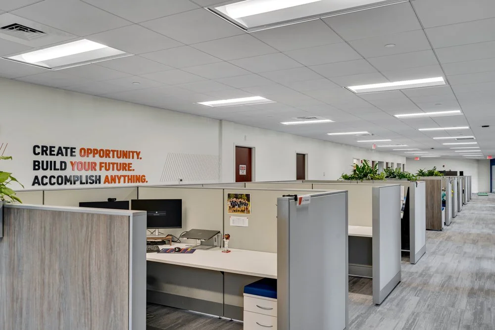 The project began with selective demolition in a fully occupied building, requiring careful coordination to minimize disruption. The new layout features private offices, training rooms, conference rooms, and an open work area—all highlighted by glass walls with custom window films and integrated floor boxes for seamless functionality.