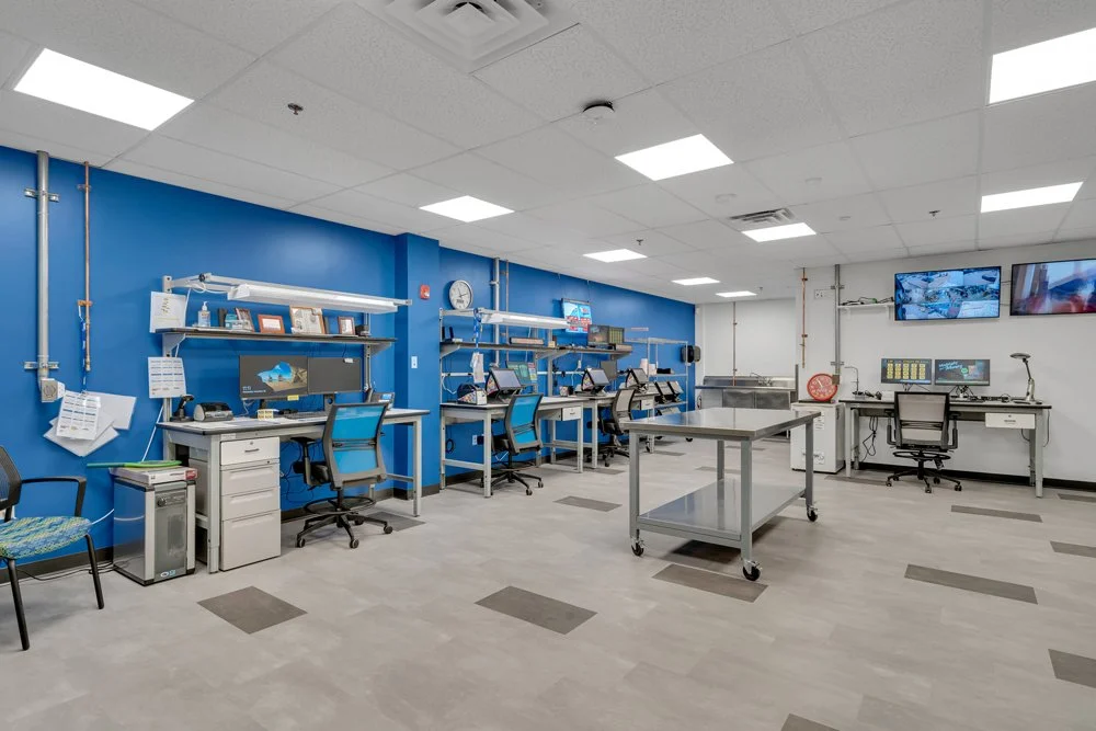 Key features included a compressed air and vacuum system, touchless fixtures, ejector pumps, and a custom millwork package with reinforced counters and stainless-steel protections for high-traffic areas.